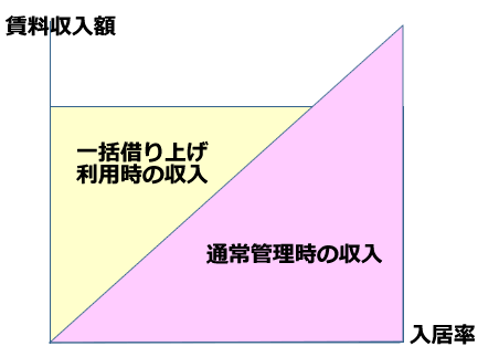図解すると左のとおりです。ピンクは通常契約の場合の収入です。入居率が高くなれば賃料収入は大きくなりますが、空室率が高くなれば逆に収入は落ち込みます。 つまり、一括借り上げシステムは、家賃(空室リスクに対する)の保険制度のようなものになります。 |